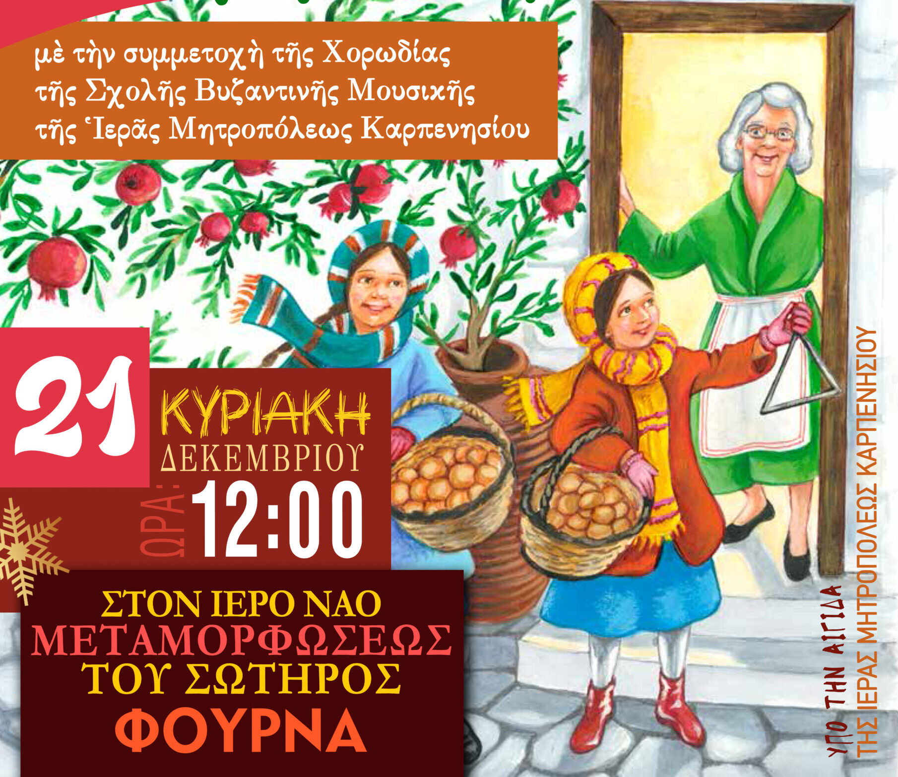 Την Κυριακή, 21 Δεκεμβρίου 2025, στις 7.00π.μ., στον Ιερό Ναό Μεταμορφώσεως Σωτήρος Φουρνάς θα τελεστεί Όρθρος και αρχιερατική Θεία Λειτουργία από τον Σεβασμιώτατο Μητροπολίτη μας κ. Γεώργιο. Στη συνέχεια, στις 12 μ.μ., θα γίνει παρουσίαση του χριστουγεννιάτικου παιδικού βιβλίου της πρεσβυτέρας Κατερίνας Σώρου – Τριβυζά «Το χριστόψωμο της γιαγιάς Ειρήνης». Η χορωδία της Ιεράς Μητροπόλεως […]